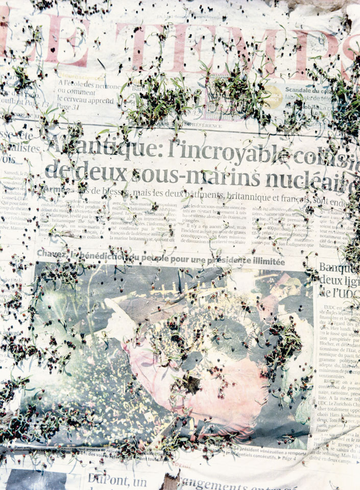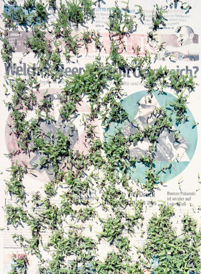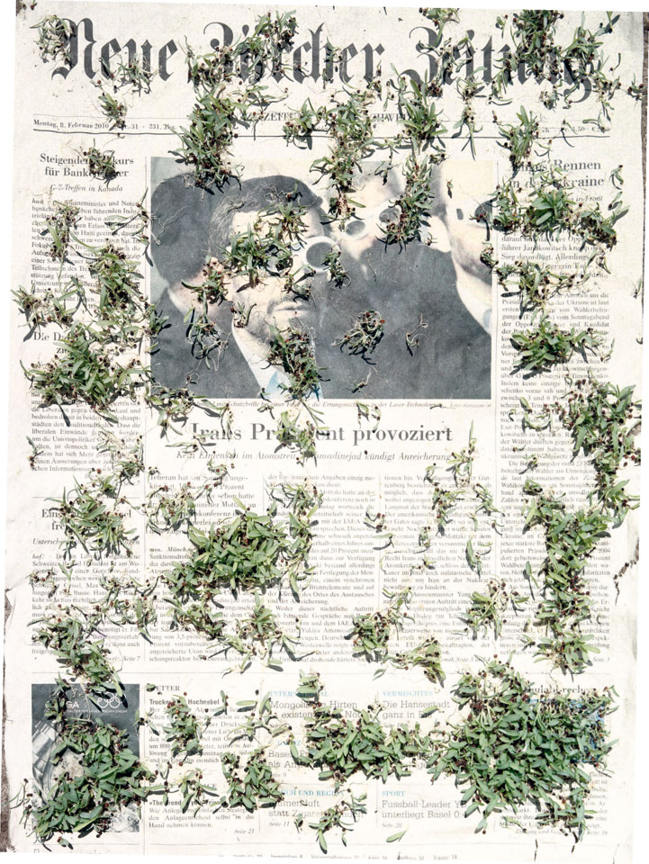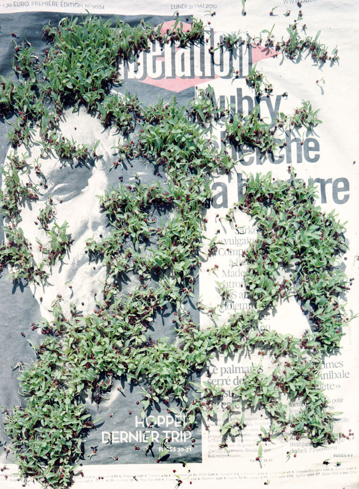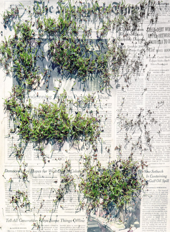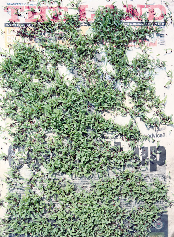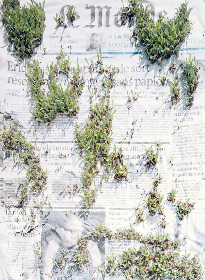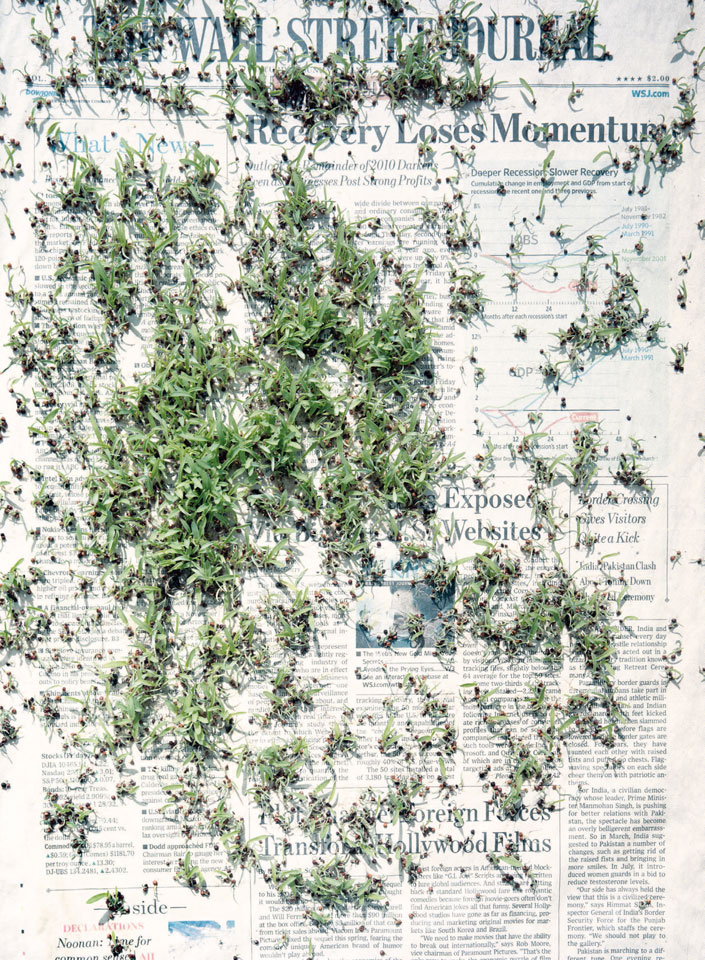 Initiated in 2010, News is Flechtner's most recent body of work, an ongoing examination of the human imprint on nature over the passing of time, and collective memories as administered by public media. Throughout it's suggested that that today's headlines are a simultaneous realization of history and of present day reality. First cultivating a variety of seeds in his garden, and then germinating the vegetation over 100 international newspapers, Flechtner photographs the publications head on, as though a document fit for an historical archive, filling his frame with the entire front page. The ensuing images, overexposed and ephemeral microcosms, allude to a human mediation in which nature is prompted to reassert itself, gradually melding and growing over the industrial world. Says Flechtner, "I'm sprinkling seeds over the newspapers; I water them and wait to see what remains. The quote of today would be, 'the excitement of today is the garden of tomorrow' ". News, shown here for the first time, is part of a larger oeuvre entitled Sites, which works around the idea of man's constant intervention to construct, control and restructure fields, gardens and parks in a decorative manner. What Flechtner attempts to convey is the confluence between the human desire to master and posses nature versus the prevailing vitality of the green kingdom.