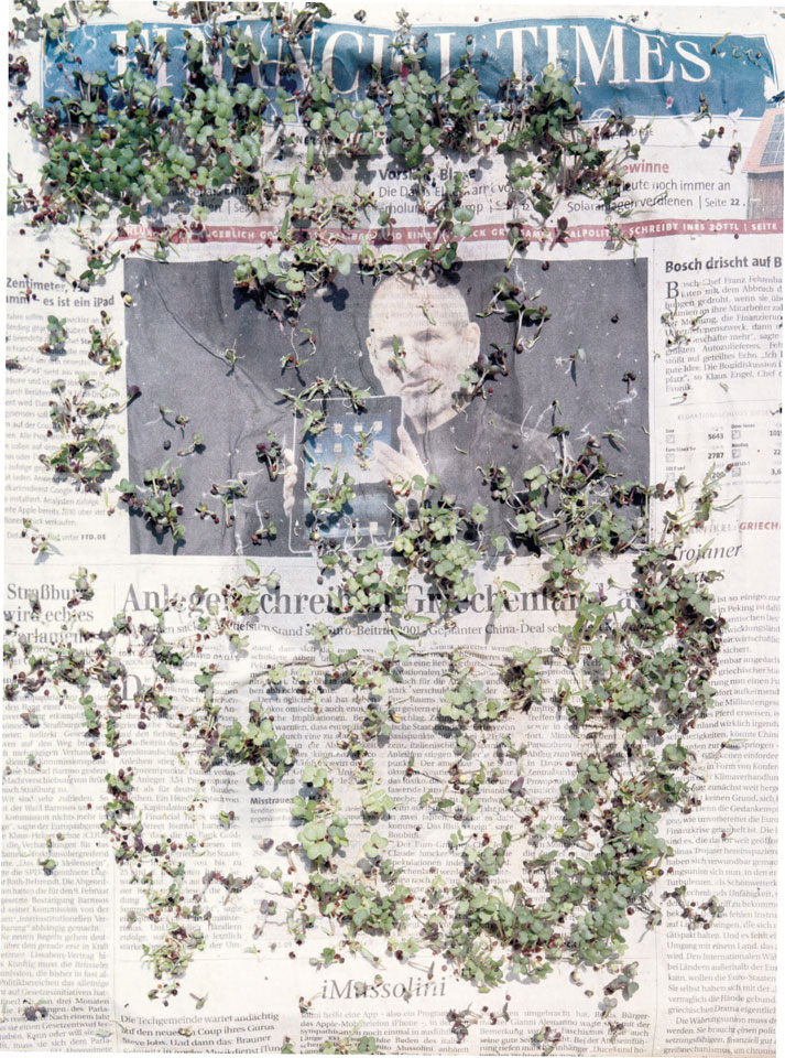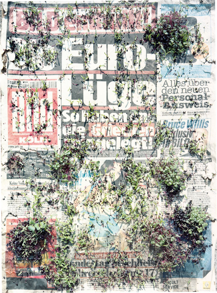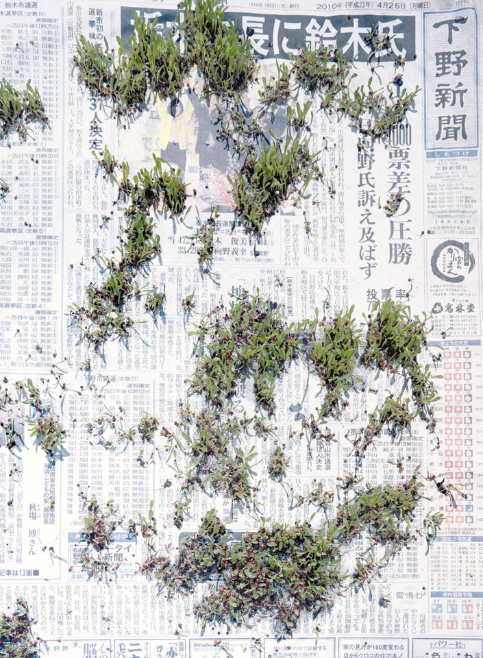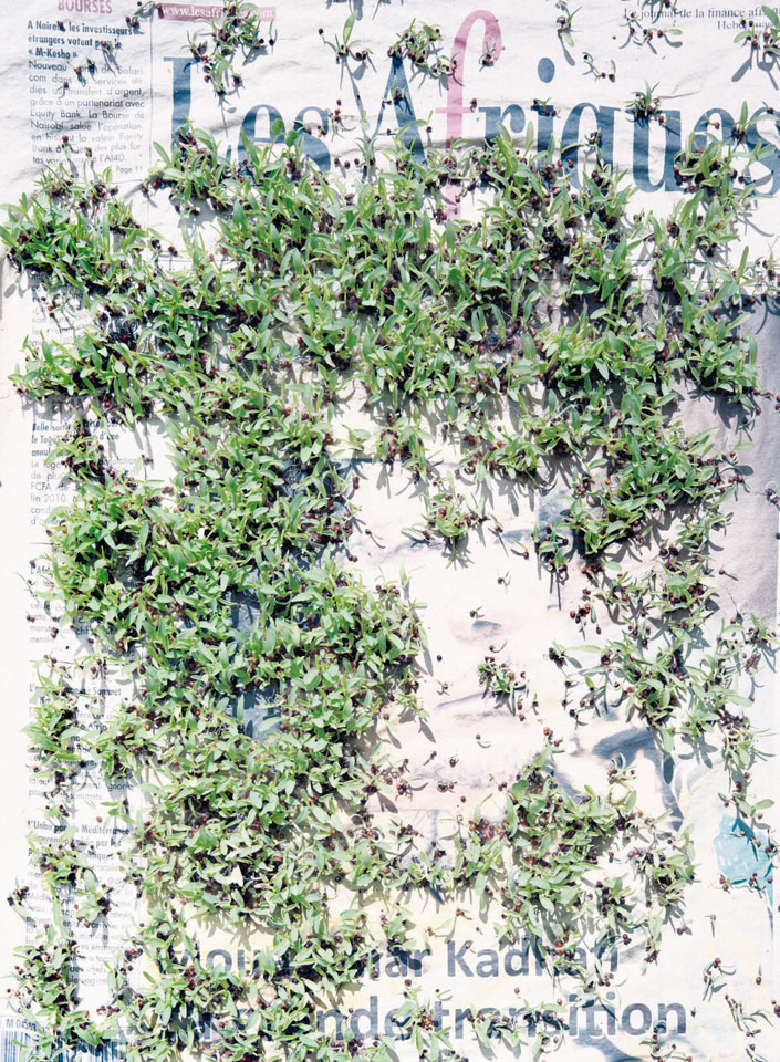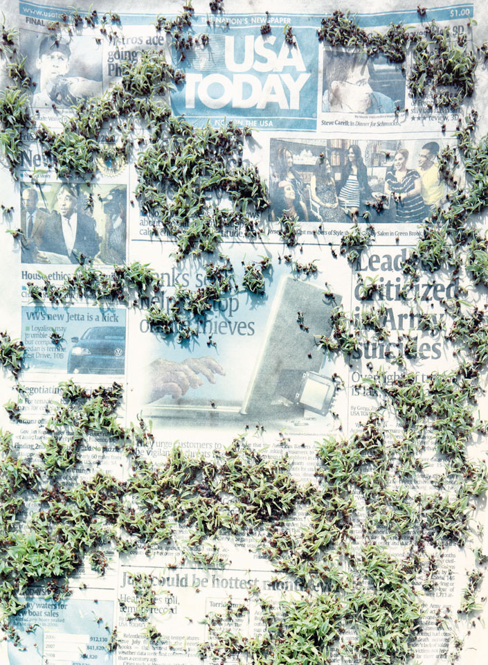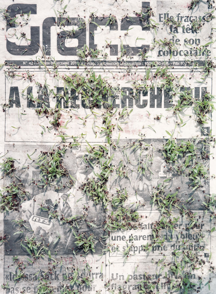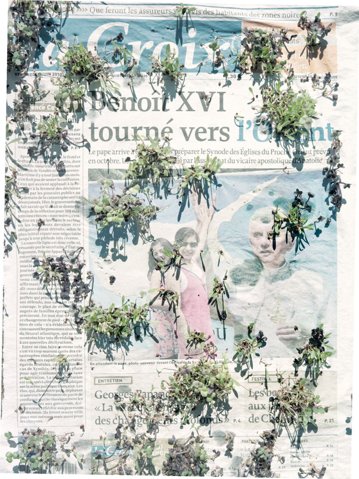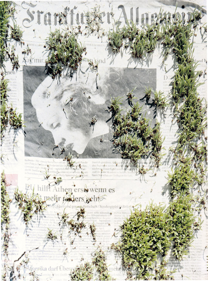 Initiated in 2010, News is Flechtner's most recent body of work, an ongoing examination of the human imprint on nature over the passing of time, and collective memories as administered by public media. Throughout it's suggested that that today's headlines are a simultaneous realization of history and of present day reality. First cultivating a variety of seeds in his garden, and then germinating the vegetation over 100 international newspapers, Flechtner photographs the publications head on, as though a document fit for an historical archive, filling his frame with the entire front page. The ensuing images, overexposed and ephemeral microcosms, allude to a human mediation in which nature is prompted to reassert itself, gradually melding and growing over the industrial world. Says Flechtner, "I'm sprinkling seeds over the newspapers; I water them and wait to see what remains. The quote of today would be, 'the excitement of today is the garden of tomorrow' ". News, shown here for the first time, is part of a larger oeuvre entitled Sites, which works around the idea of man's constant intervention to construct, control and restructure fields, gardens and parks in a decorative manner. What Flechtner attempts to convey is the confluence between the human desire to master and posses nature versus the prevailing vitality of the green kingdom.