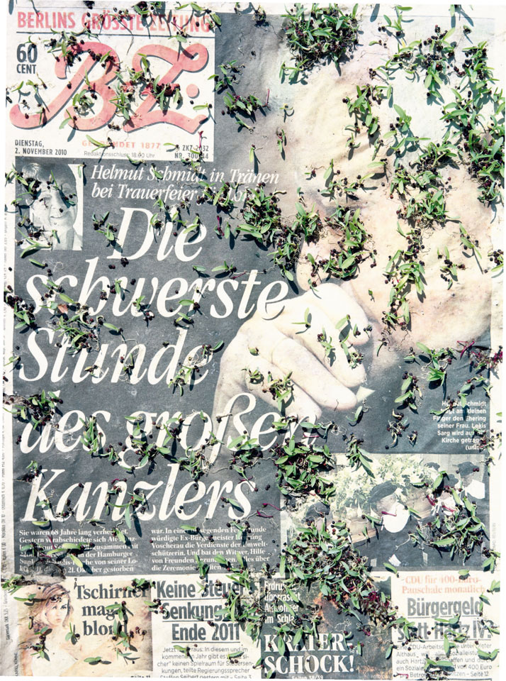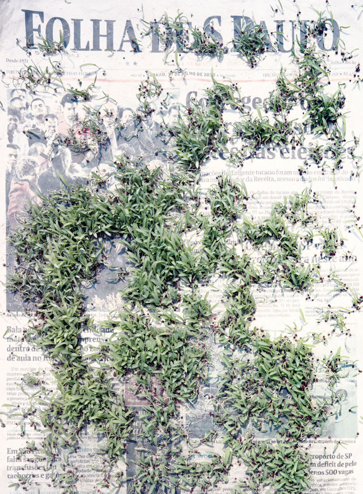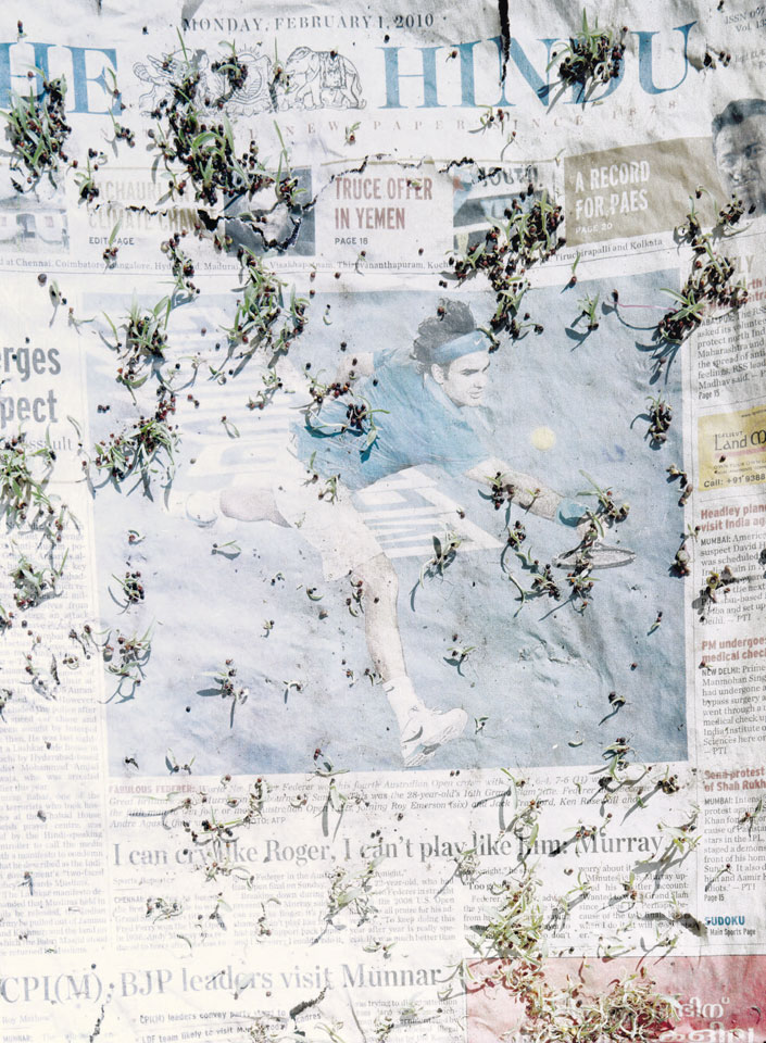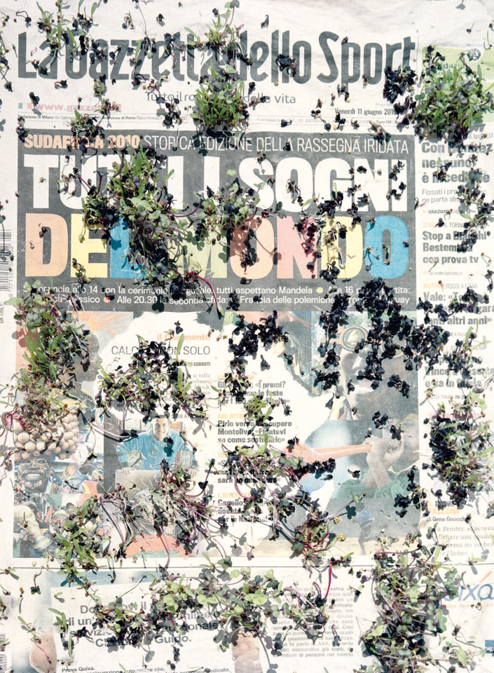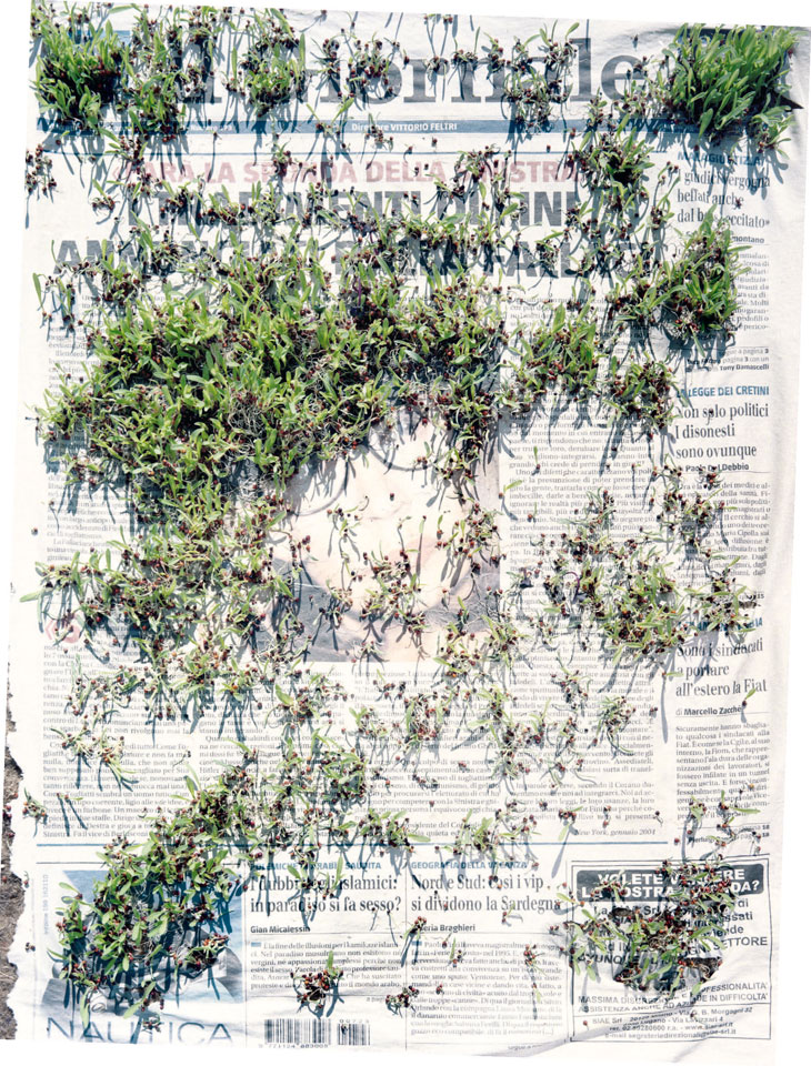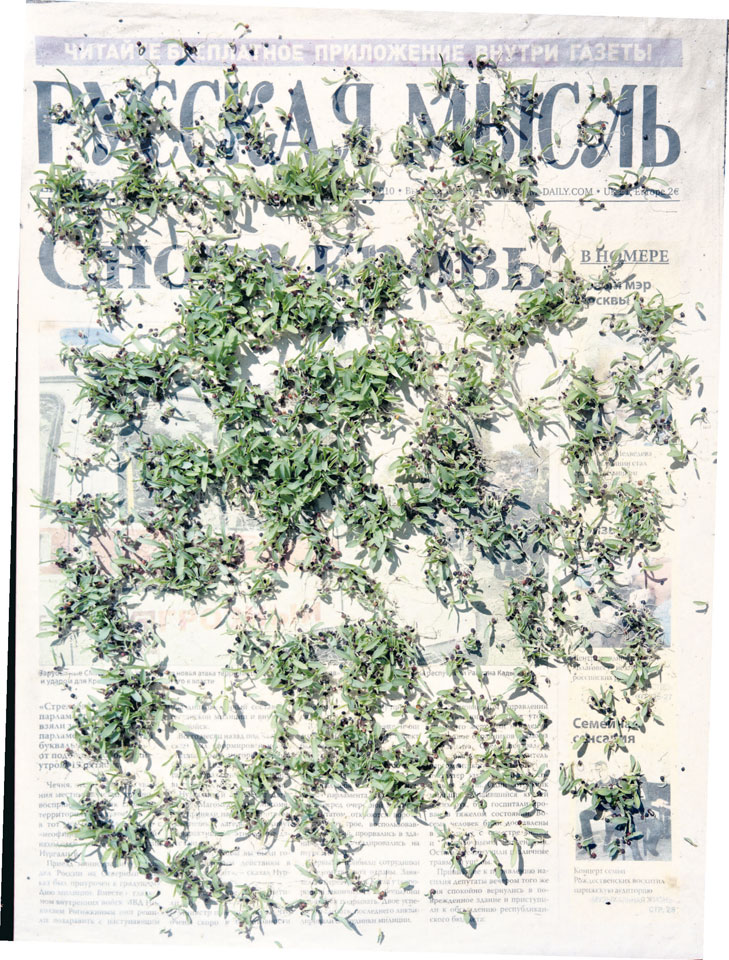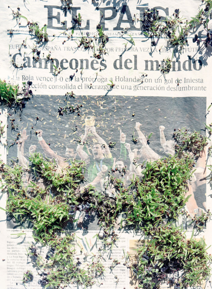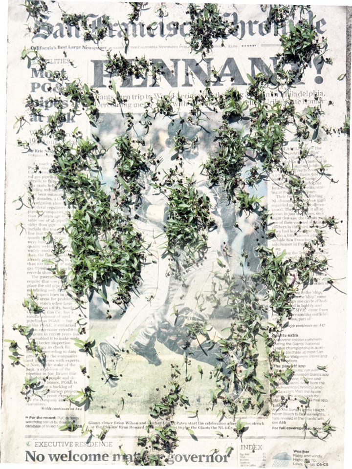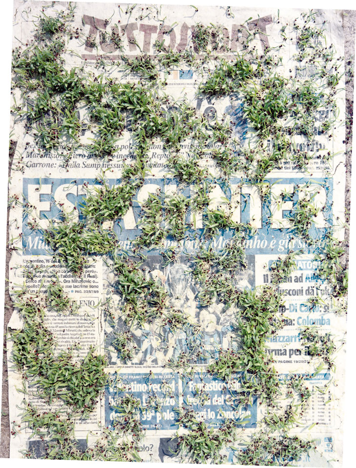 Initiated in 2010, News is Flechtner's most recent body of work, an ongoing examination of the human imprint on nature over the passing of time, and collective memories as administered by public media. Throughout it's suggested that that today's headlines are a simultaneous realization of history and of present day reality. First cultivating a variety of seeds in his garden, and then germinating the vegetation over 100 international newspapers, Flechtner photographs the publications head on, as though a document fit for an historical archive, filling his frame with the entire front page. The ensuing images, overexposed and ephemeral microcosms, allude to a human mediation in which nature is prompted to reassert itself, gradually melding and growing over the industrial world. Says Flechtner, "I'm sprinkling seeds over the newspapers; I water them and wait to see what remains. The quote of today would be, 'the excitement of today is the garden of tomorrow' ". News, shown here for the first time, is part of a larger oeuvre entitled Sites, which works around the idea of man's constant intervention to construct, control and restructure fields, gardens and parks in a decorative manner. What Flechtner attempts to convey is the confluence between the human desire to master and posses nature versus the prevailing vitality of the green kingdom.