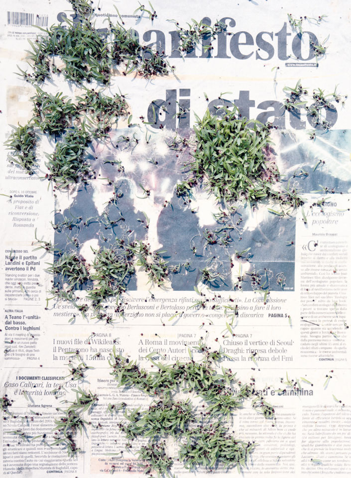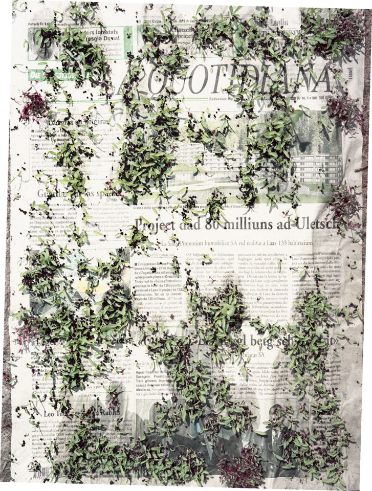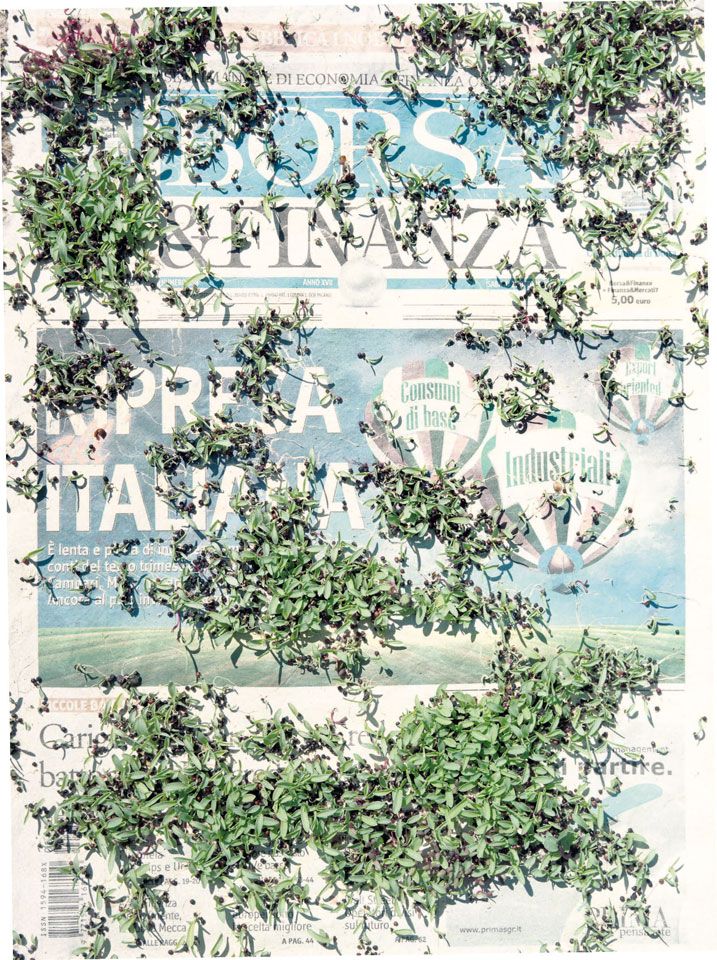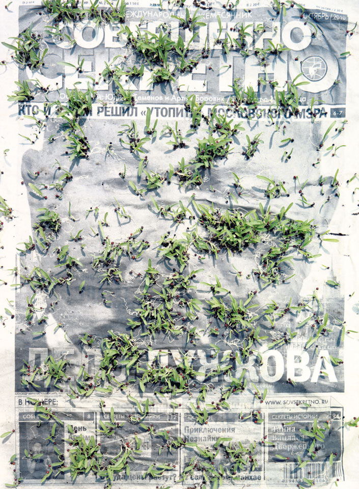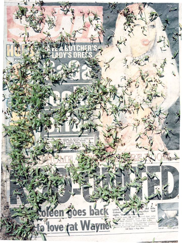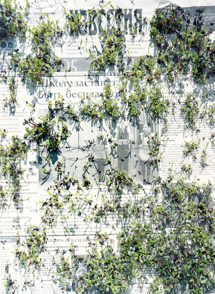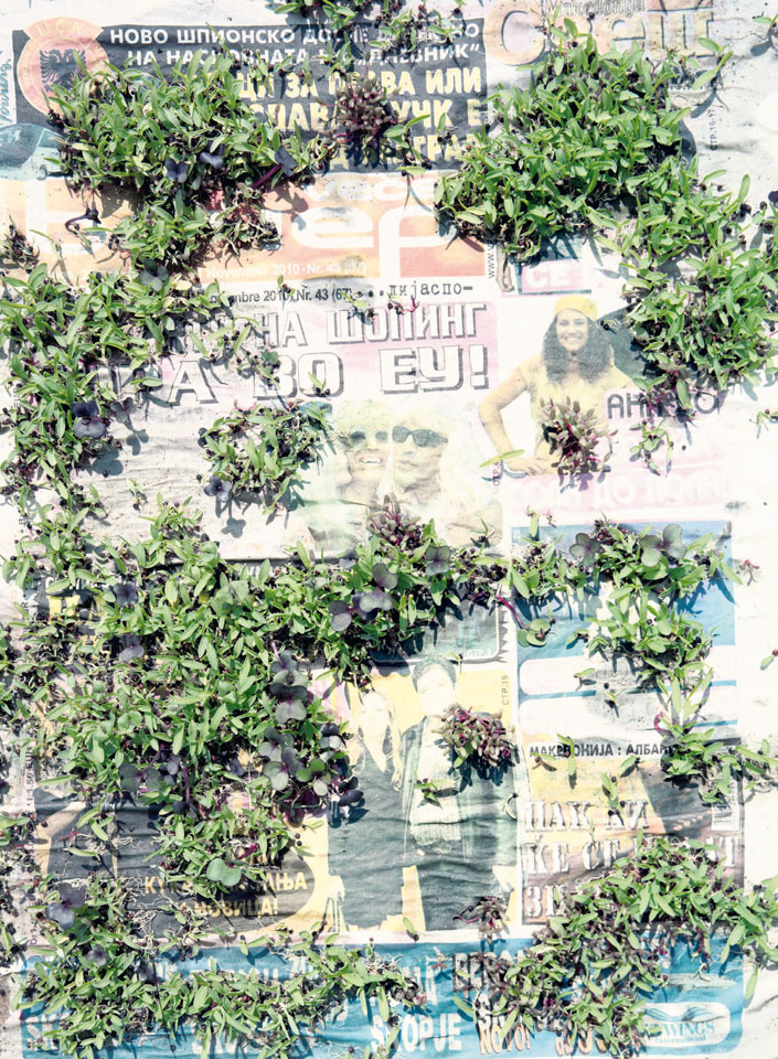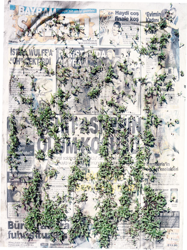 Initiated in 2010, News is Flechtner's most recent body of work, an ongoing examination of the human imprint on nature over the passing of time, and collective memories as administered by public media. Throughout it's suggested that that today's headlines are a simultaneous realization of history and of present day reality. First cultivating a variety of seeds in his garden, and then germinating the vegetation over 100 international newspapers, Flechtner photographs the publications head on, as though a document fit for an historical archive, filling his frame with the entire front page. The ensuing images, overexposed and ephemeral microcosms, allude to a human mediation in which nature is prompted to reassert itself, gradually melding and growing over the industrial world. Says Flechtner, "I'm sprinkling seeds over the newspapers; I water them and wait to see what remains. The quote of today would be, 'the excitement of today is the garden of tomorrow' ". News, shown here for the first time, is part of a larger oeuvre entitled Sites, which works around the idea of man's constant intervention to construct, control and restructure fields, gardens and parks in a decorative manner. What Flechtner attempts to convey is the confluence between the human desire to master and posses nature versus the prevailing vitality of the green kingdom.