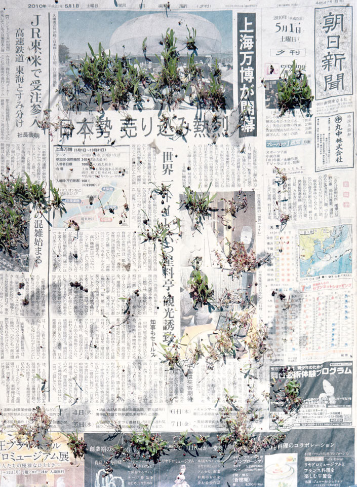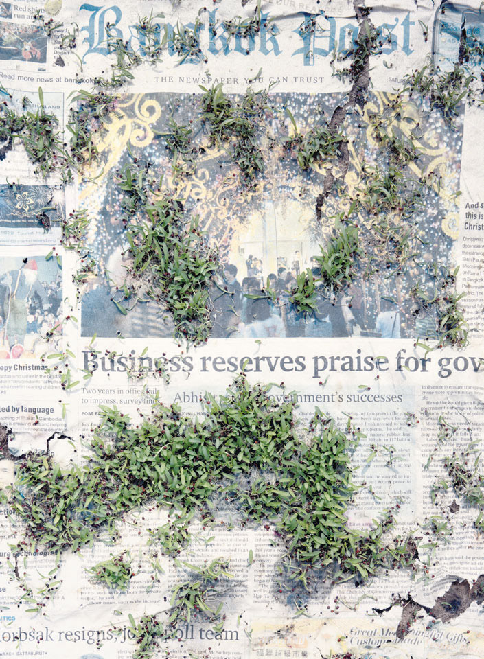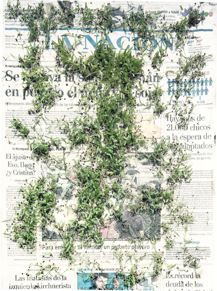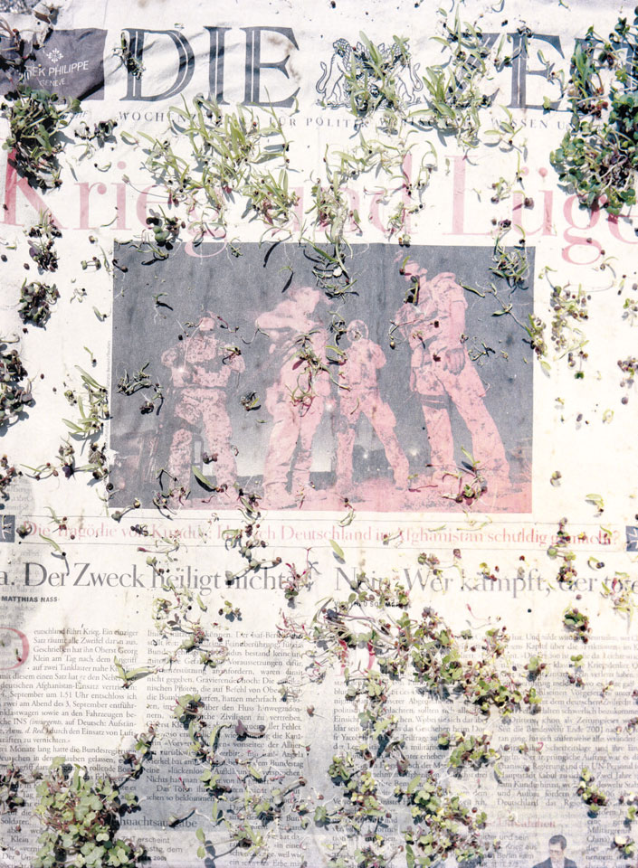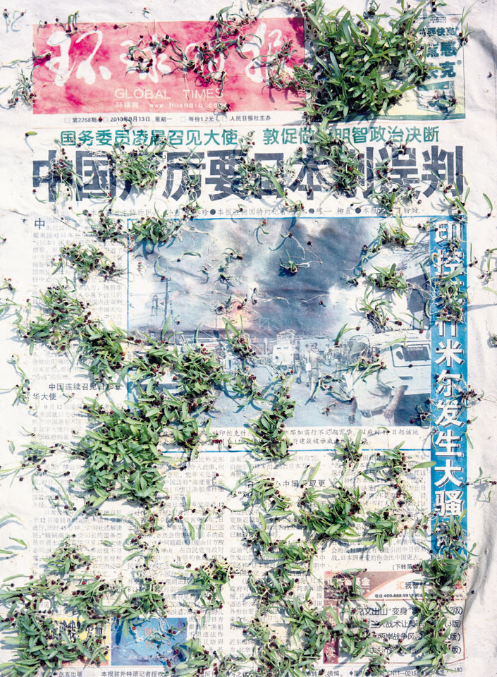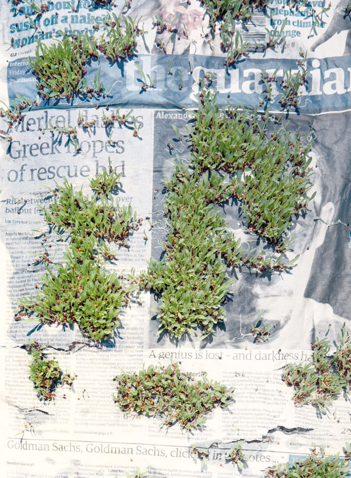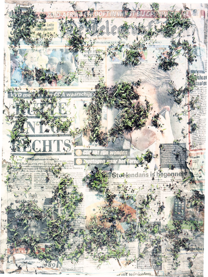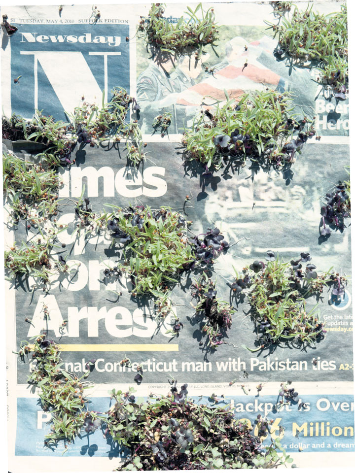 Initiated in 2010, News is Flechtner's most recent body of work, an ongoing examination of the human imprint on nature over the passing of time, and collective memories as administered by public media. Throughout it's suggested that that today's headlines are a simultaneous realization of history and of present day reality. First cultivating a variety of seeds in his garden, and then germinating the vegetation over 100 international newspapers, Flechtner photographs the publications head on, as though a document fit for an historical archive, filling his frame with the entire front page. The ensuing images, overexposed and ephemeral microcosms, allude to a human mediation in which nature is prompted to reassert itself, gradually melding and growing over the industrial world. Says Flechtner, "I'm sprinkling seeds over the newspapers; I water them and wait to see what remains. The quote of today would be, 'the excitement of today is the garden of tomorrow' ". News, shown here for the first time, is part of a larger oeuvre entitled Sites, which works around the idea of man's constant intervention to construct, control and restructure fields, gardens and parks in a decorative manner. What Flechtner attempts to convey is the confluence between the human desire to master and posses nature versus the prevailing vitality of the green kingdom.