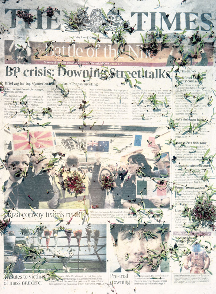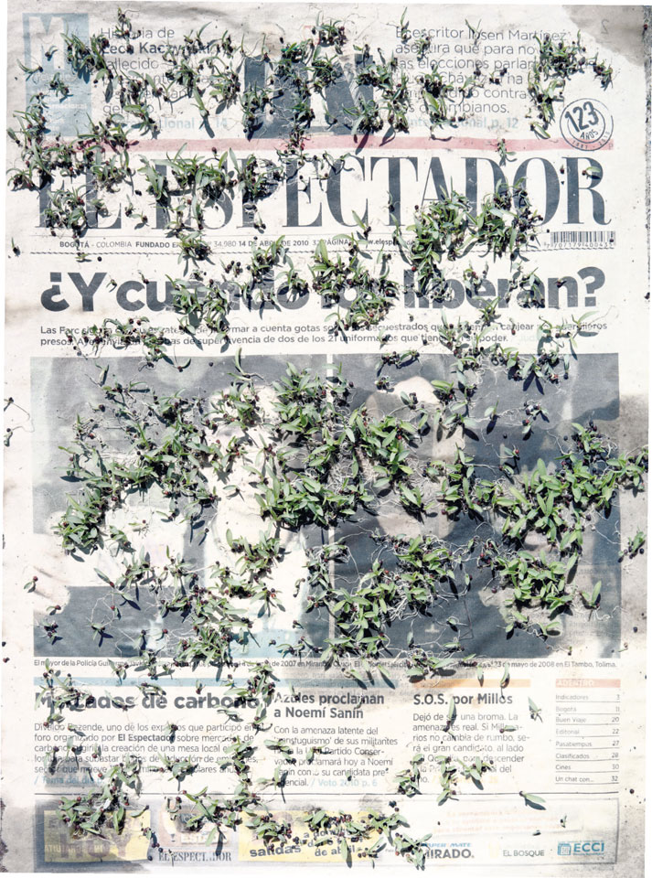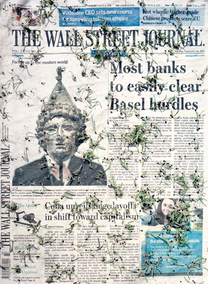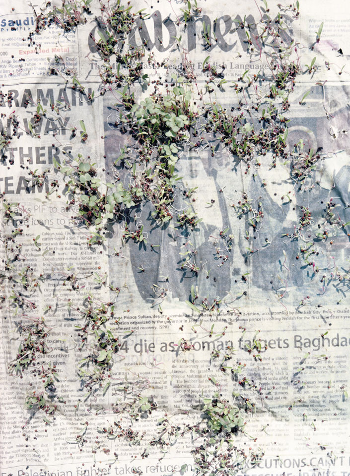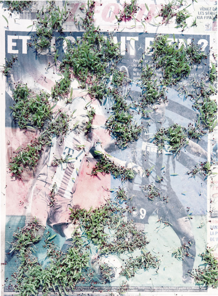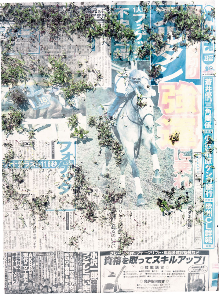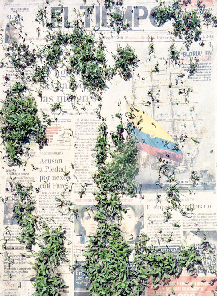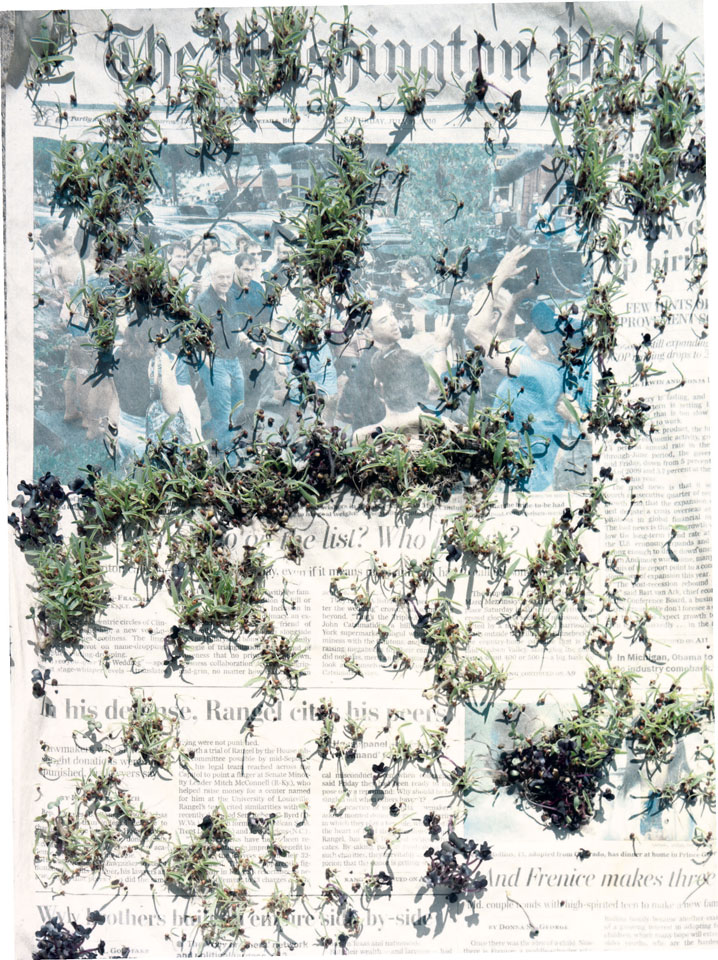 Initiated in 2010, News is Flechtner's most recent body of work, an ongoing examination of the human imprint on nature over the passing of time, and collective memories as administered by public media. Throughout it's suggested that that today's headlines are a simultaneous realization of history and of present day reality. First cultivating a variety of seeds in his garden, and then germinating the vegetation over 100 international newspapers, Flechtner photographs the publications head on, as though a document fit for an historical archive, filling his frame with the entire front page. The ensuing images, overexposed and ephemeral microcosms, allude to a human mediation in which nature is prompted to reassert itself, gradually melding and growing over the industrial world. Says Flechtner, "I'm sprinkling seeds over the newspapers; I water them and wait to see what remains. The quote of today would be, 'the excitement of today is the garden of tomorrow' ". News, shown here for the first time, is part of a larger oeuvre entitled Sites, which works around the idea of man's constant intervention to construct, control and restructure fields, gardens and parks in a decorative manner. What Flechtner attempts to convey is the confluence between the human desire to master and posses nature versus the prevailing vitality of the green kingdom.