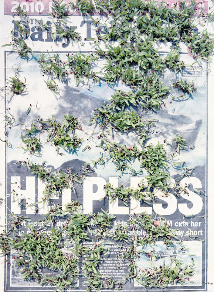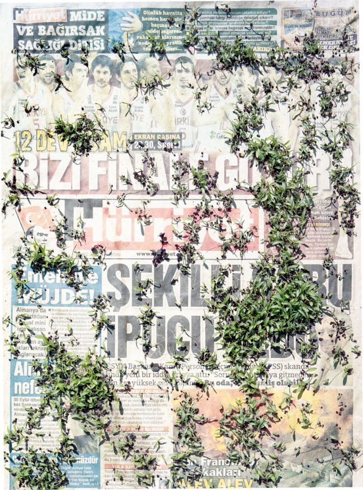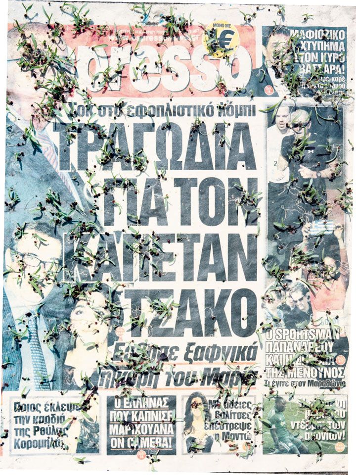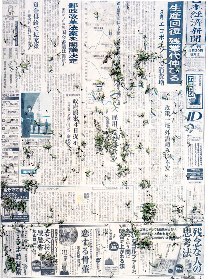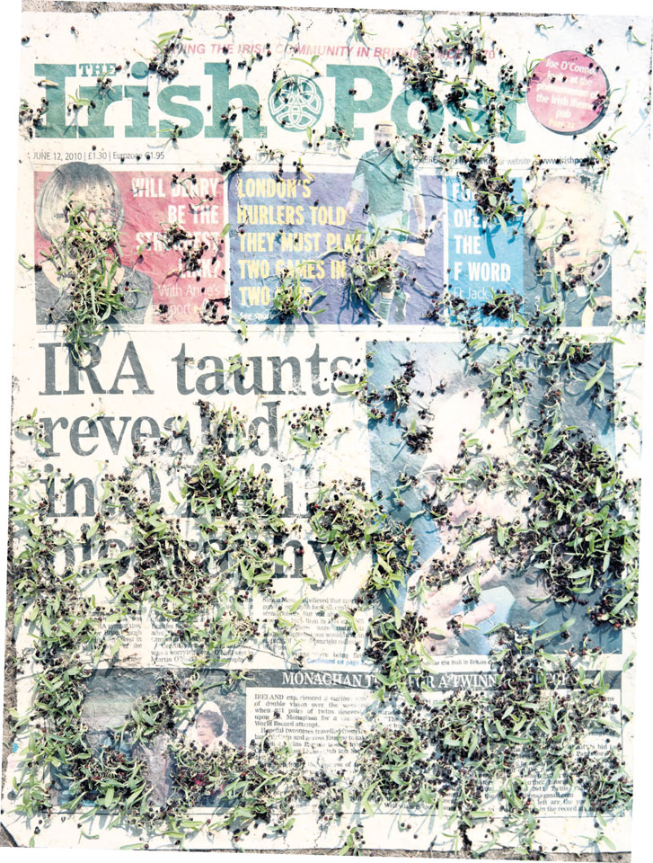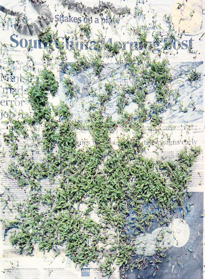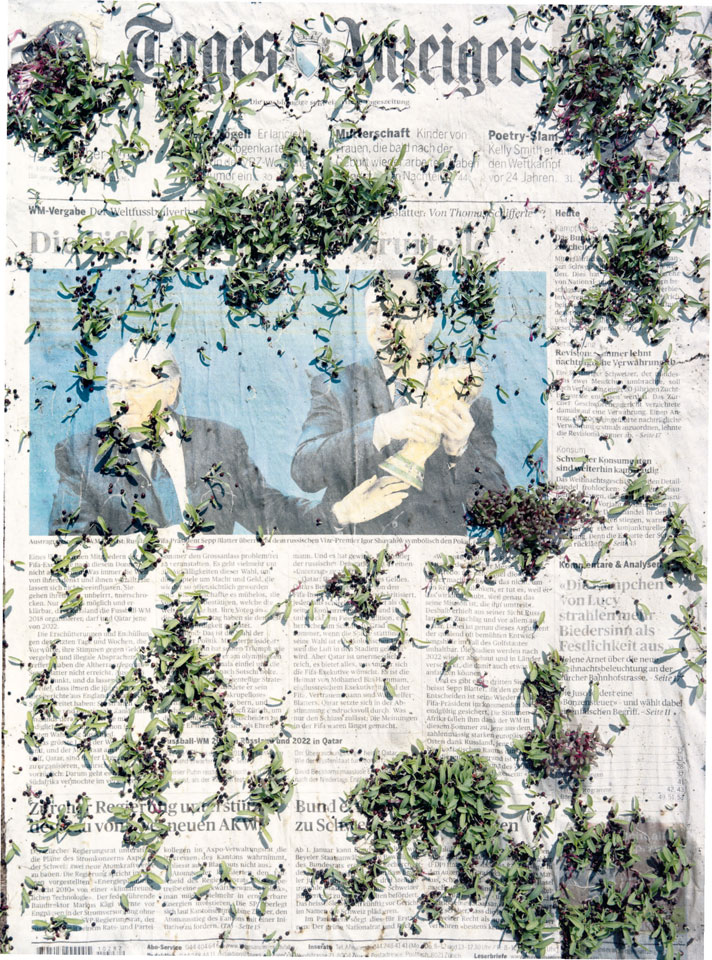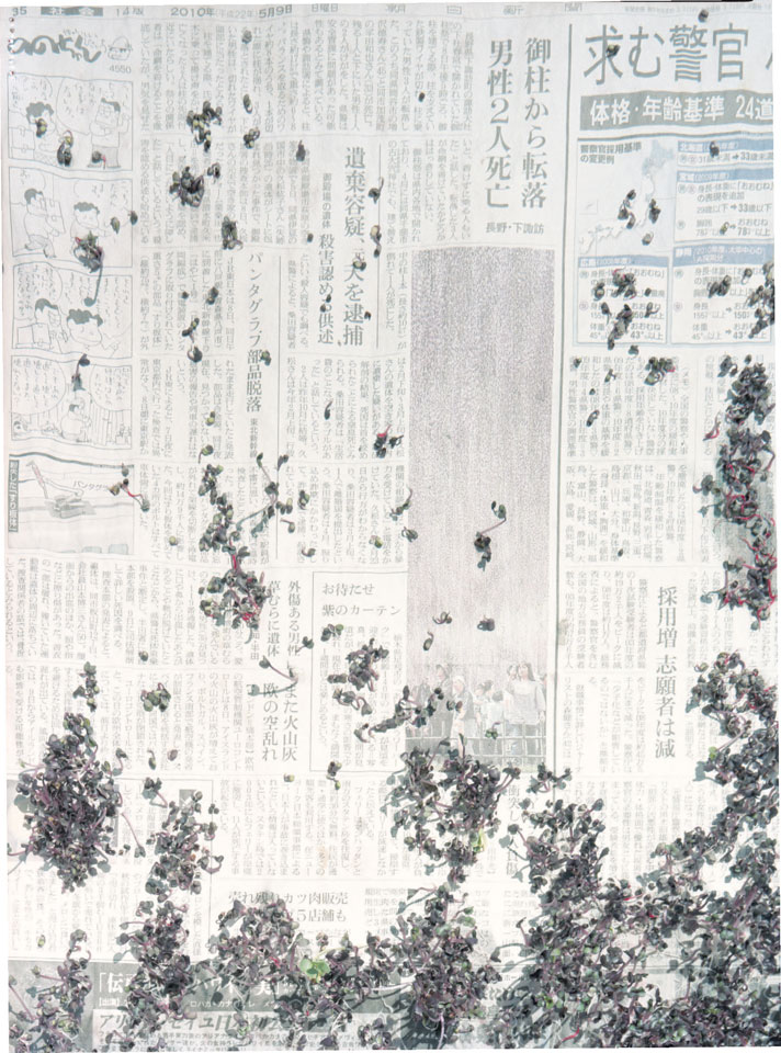 Initiated in 2010, News is Flechtner's most recent body of work, an ongoing examination of the human imprint on nature over the passing of time, and collective memories as administered by public media. Throughout it's suggested that that today's headlines are a simultaneous realization of history and of present day reality. First cultivating a variety of seeds in his garden, and then germinating the vegetation over 100 international newspapers, Flechtner photographs the publications head on, as though a document fit for an historical archive, filling his frame with the entire front page. The ensuing images, overexposed and ephemeral microcosms, allude to a human mediation in which nature is prompted to reassert itself, gradually melding and growing over the industrial world. Says Flechtner, "I'm sprinkling seeds over the newspapers; I water them and wait to see what remains. The quote of today would be, 'the excitement of today is the garden of tomorrow' ". News, shown here for the first time, is part of a larger oeuvre entitled Sites, which works around the idea of man's constant intervention to construct, control and restructure fields, gardens and parks in a decorative manner. What Flechtner attempts to convey is the confluence between the human desire to master and posses nature versus the prevailing vitality of the green kingdom.