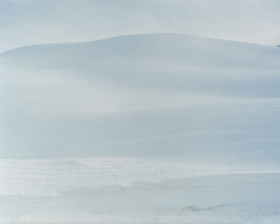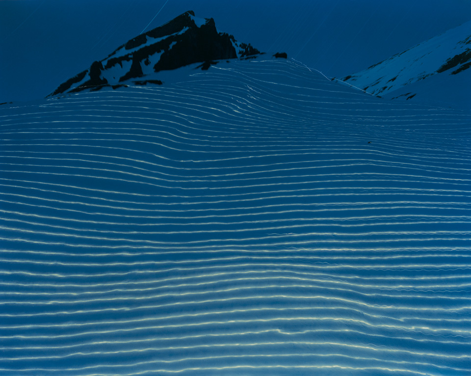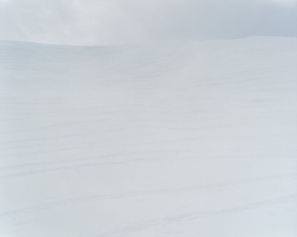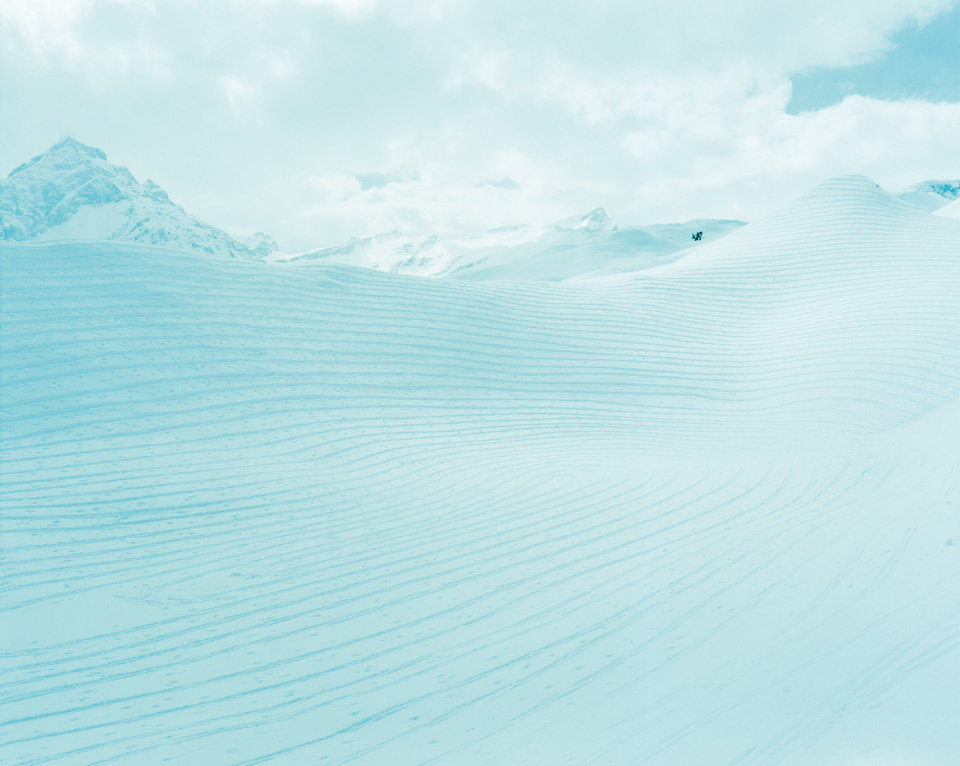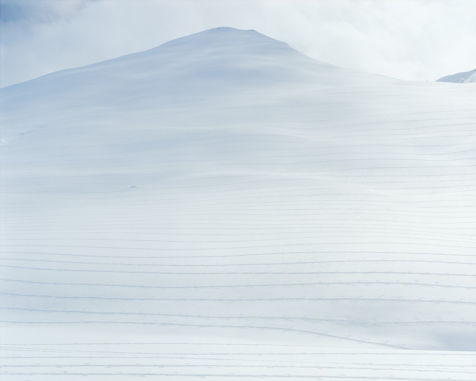 Thomas Flechtner, inspired by many days of walking with his feet on skins, has been working during three years on his ‹Walks› compositions. Surfaces covered by virgin snow and free of treads make us think of photographic plates. Here we do have not any silver salt, what we have is snowflakes reacting to the passage of the artist, alone, with his feet on skis. He is light. He is the agent that will reveal a shape. After having placed his camara within a distance from the space he wants to cover and having decided on a particular frame, Thomas Flechtner chooses the time of exposure that corresponds effectively to the time the marking will take.