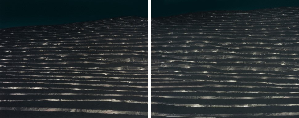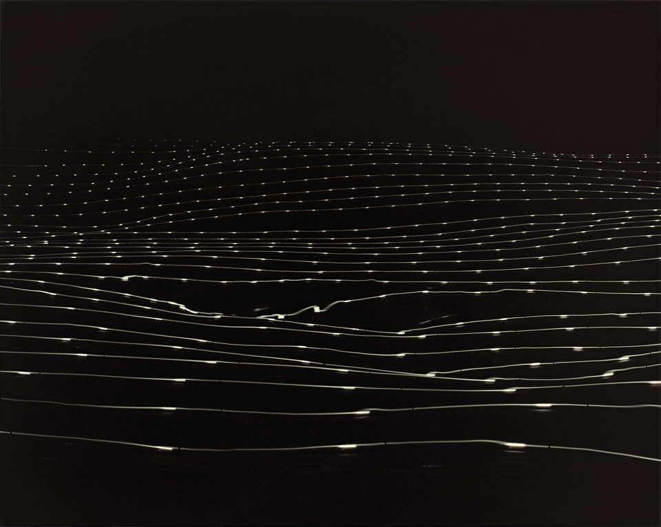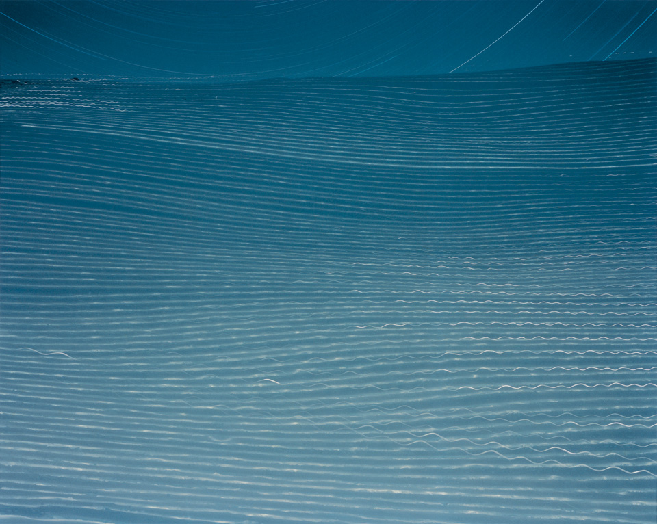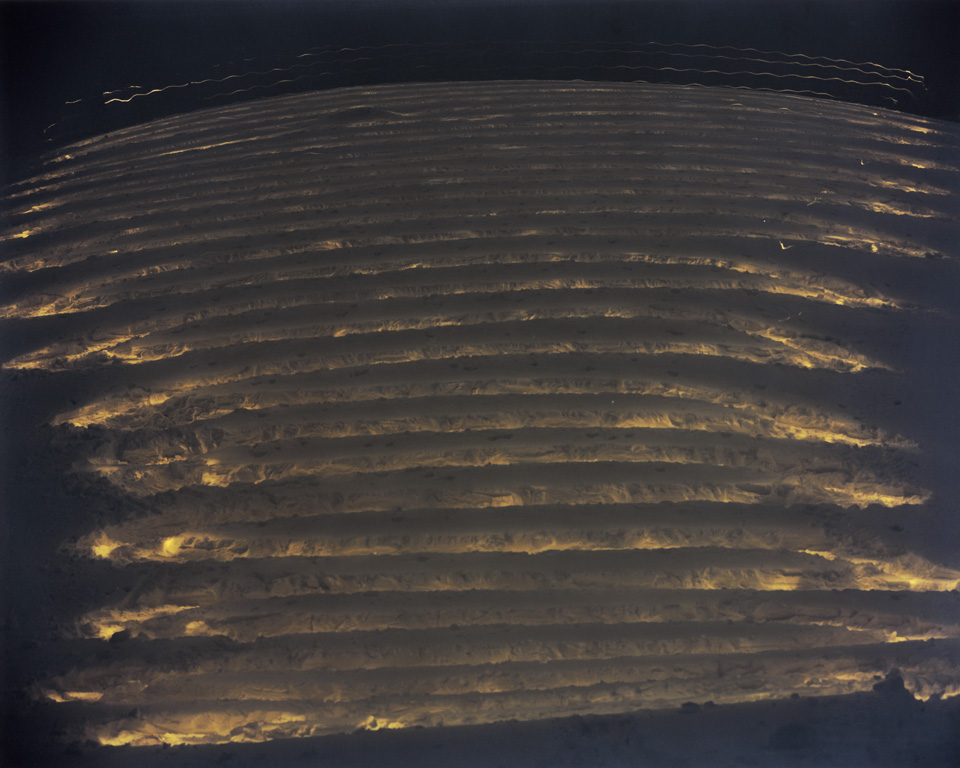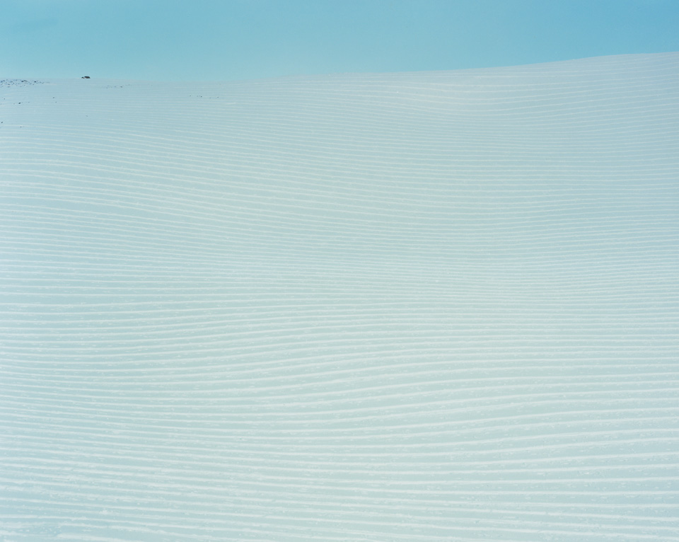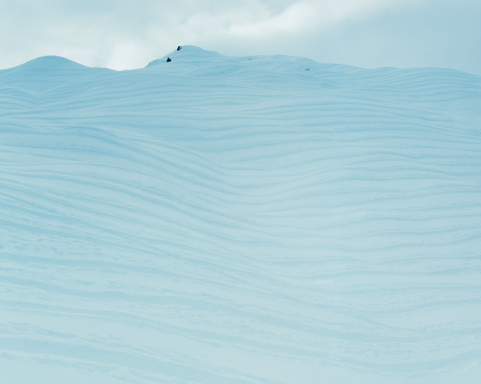 Thomas Flechtner, inspired by many days of walking with his feet on skins, has been working during three years on his ‹Walks› compositions. Surfaces covered by virgin snow and free of treads make us think of photographic plates. Here we do have not any silver salt, what we have is snowflakes reacting to the passage of the artist, alone, with his feet on skis. He is light. He is the agent that will reveal a shape. After having placed his camara within a distance from the space he wants to cover and having decided on a particular frame, Thomas Flechtner chooses the time of exposure that corresponds effectively to the time the marking will take.